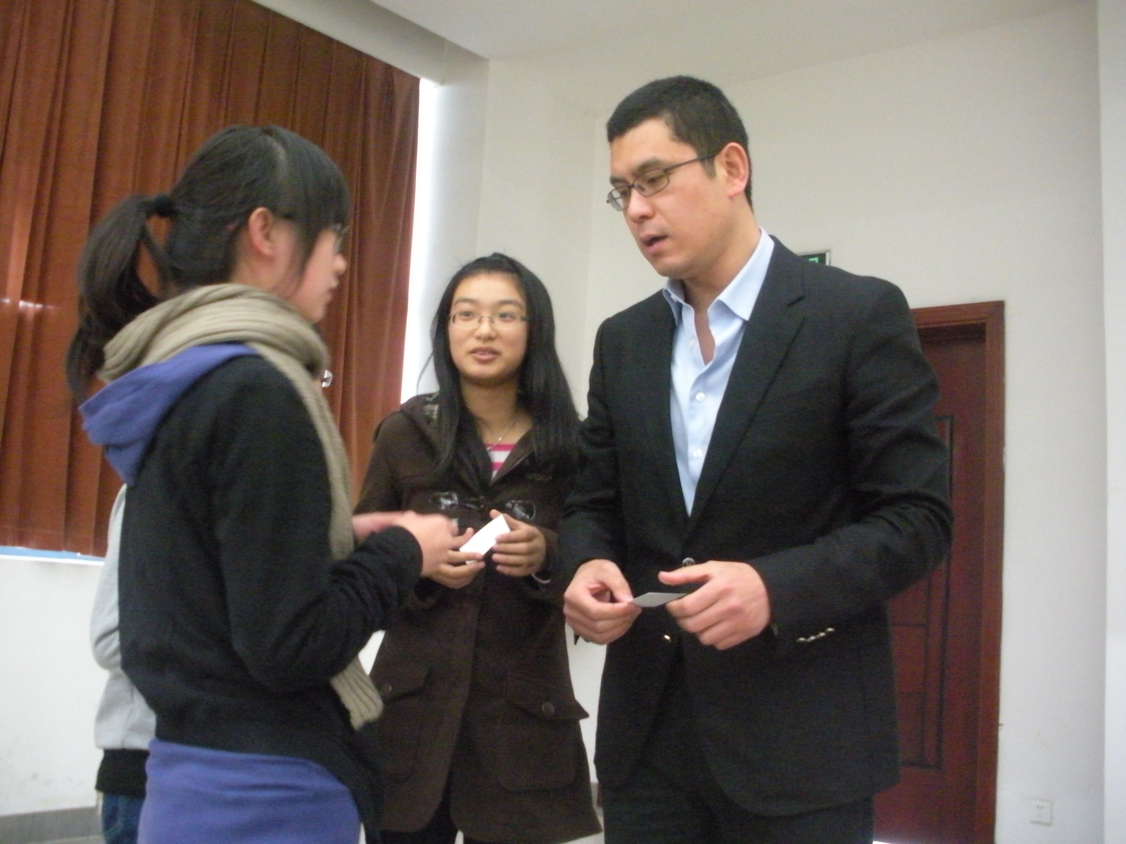 校友何刚随后为同学们主讲了职业生涯导航讲座。他由自已在大学及工作岗位上的亲身经历开始讲起,为同学们简单讲述了他的拼搏史,告诉同学们在学习上要“守寂寞”,脚踏实地,“读万卷书更要行万里路”,鼓励同学们“走出去看看”;在职场上要重“积累”,学会“沟通”与“坚持”,并能够为每一个机会“做好准备”进而“把握机会”,他说“机会只会为有准备的人打开一扇窗”。他从经济危机谈到当今通货膨胀,从历史人文谈到国家政策,从锻炼身体谈到自身安全保护。同学们对他的博闻强识深感佩服,在问答环节,他认真聆听了学生们的疑问、困惑,并就自身经验进行了详细解答。最后,他对同学们提出了要求,他说,要做一个“有大局观”的人。
