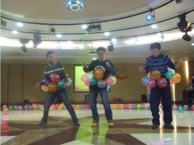 在三大组织各部长带来的劲爆辣舞中,晚会正式拉开帷幕。各种雷人舞蹈、歌曲、舞台剧、广播操轮番登场,挑逗着观众的视听神经。第八套广播操表演颠覆传统,各种搞笑桥段被搬上舞台,赢得了场下雷鸣般的掌声;学代会成员表演的《唐伯虎点秋香》笑翻全场,“gelivable”“浮云”等一系列流行语成了古人的口头禅,秋香与伯虎跳起了现代劲舞,引得场下观众笑声不断;学生会成员表演的搞笑舞蹈《pork face》将Lady GaGa的精髓表现得淋漓尽致;由裴老师领衔的党支部成员带来了他们新年的问候。一首诗朗诵《这一年,我们携手走过》向我们轻轻述说着这一年的故事,为晚会带来了一股清新之风。在同学们的强烈呼吁下,何老师和裴老师也倾情献演,分别带来了歌曲和京剧,惊艳全场。在晚会中还穿插着各部门成员新年愿望的VCR,很好的体现了晚会的主题。中间的游戏环节也别具一格,将现场气氛推向一个小高潮。