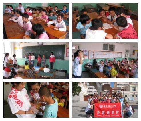 在课堂中,大学生带领小学生们做了一些经过精心改编的英语小游戏,如萝卜蹲被改编成了“apple down”,画鼻子也被改编成用英语交流,通过这些小朋友耳熟能详的小游戏把英语潜移默化的教给孩子们,让他们在欢声笑语中也能把枯燥的英语记在脑海中。在做游戏的过程中,实践团的同学们把自己从上海带来的礼物分发给小朋友们作为奖励。这些礼物都是他们的同班同学自发捐赠的,希望实践团的同学能把自己的爱心带给甘肃的小朋友。看到小朋友们拿到礼品一个个笑靥如花的样子,同学们都觉得自己两天一夜的火车是值得的,离开家人是值得的,精心准备的一切都是值得的。别看北关小学的孩子都是来自于农村,这些孩子和同学们交流时表现出了和城里孩子一样的聪明和活泼。同学们乐教,孩子们乐学,在笑声中他们的距离一再的缩短。临走时,孩子们拉着大学生的手不愿意松开,一定要带她们去自己家做客。脸上表现出的恋恋不舍让大家感动不已。