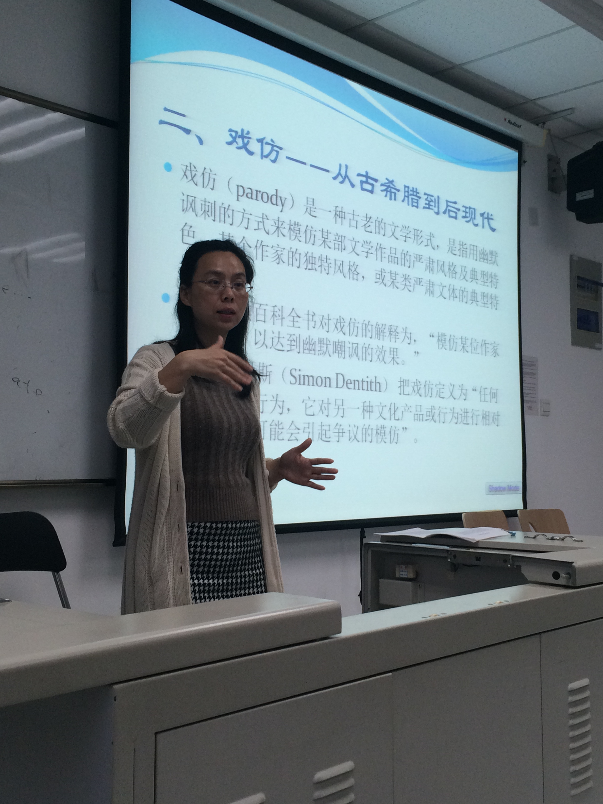 4月22日周三晚六点,外语学院陈丽老师在奉贤校区E教418教室作了题为《后现代语境下的戏仿时代》的讲座。外语学院二三年级的学生参加了本次讲座。  在讲座中,陈丽老师追溯了戏仿的历史起源,梳理了它的历史发展脉络,将戏仿放置在后现代的语境下,并分析其在目前流行的文化及社会哲学背景。讲座运用了雅克·德里达(Jacques Derrida)等的解构主义理论,以及米哈伊尔·巴赫金(Mikhail Bakhtin)的狂欢化诗学,说明戏仿作为一种文本策略,体现了后现代的叙事精神,即后现代文本的虚构性、不确定性和游戏性。而戏仿作为一种文化现象,折射后现代文化的颠覆性、平等性和大众性。 本次讲座是外语学院英美文学科研团队入驻奉贤的系列讲座之一。 |