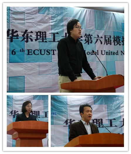 24日下午,大会开幕式在图文信息中心通海厅举行,校团委书记倪炜,教务处副处长沈文君,外国语学院副院长颜静兰、党总支副书记张攀、英语系主任杨慧敏和指导教师等出席了开幕式。倪炜在欢迎中表示,大学社团是提高学生综合素质的重要途径,华东理工大学模拟联合国协会活动的宗旨在于强调合作和促进青年学生的全面发展。沈文君在致辞中表示,模拟联合国活动契合我校实施素质教育和创新教育的精神内涵。颜静兰在发言中说道,模拟联合国活动能帮助我们学校培养人才,发现人才,同时也为各校学子提供一个交流合作的平台。最后,华东理工大学模拟联合国协会会长、本届大会秘书长张琰同学致词并宣布大会开幕。