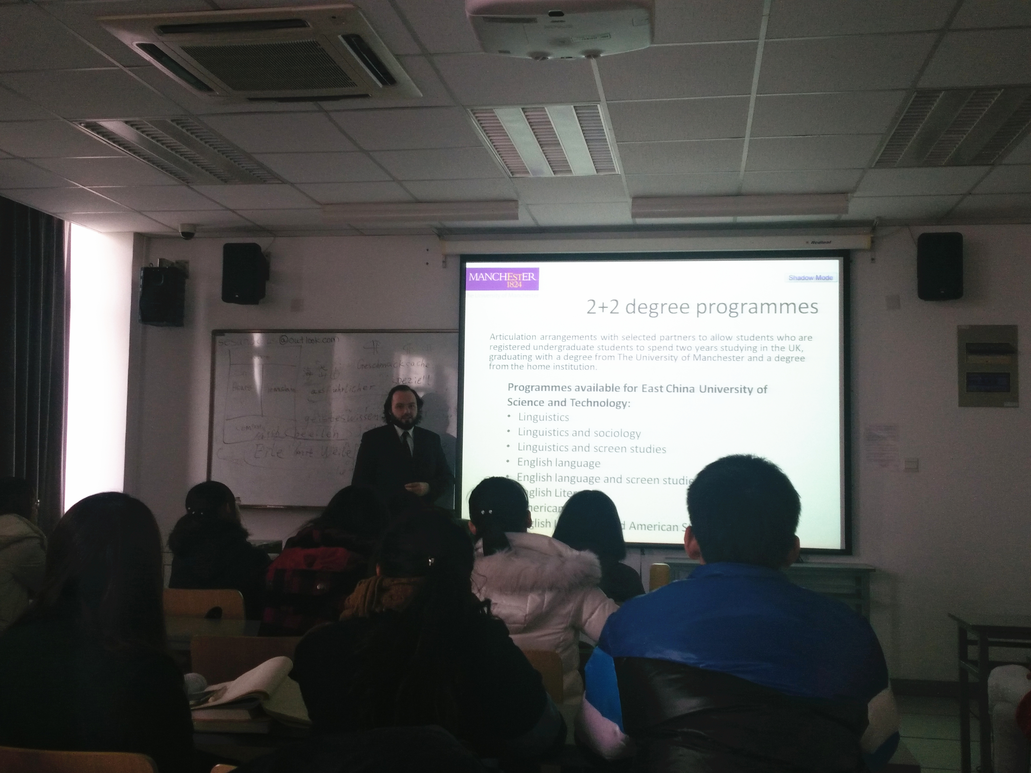 推介活动在E教418教室进行,一段介绍曼大的人文历史,科研成果,教学资源,学术成就以及各国学生诉说亲身感受的视频拉开活动序幕。Walkden教授用PPT更加详细地讲述了曼大的历史进程,学校资源,院系设置等等,还展示了曼大充满了文化艺术气息的图书馆,艺术长廊,曼大的各国美食以及文化交流广角的图片。