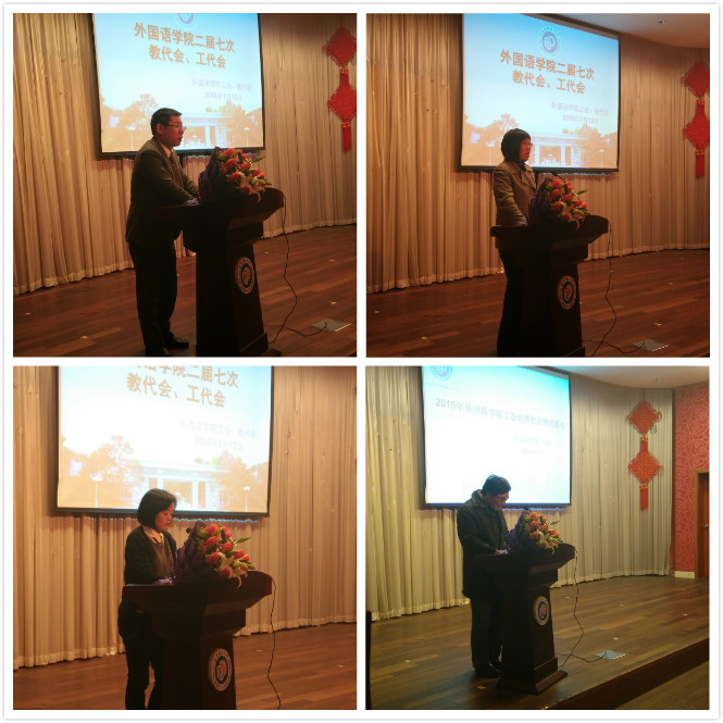 1月12日下午,外国语学院在工会八角亭召开了2015年总结会暨第二届第七次教代会、和工代会。学院党政领导和双代会代表出席了会议,全院教职工参会。工会委员张凤云主持会议。 会上,张正军副院长(主持工作)作了2015年度学院工作报告。他回顾了2015年学院在人才培养、师资队伍建设、学科建设和科研工作、国际交流与合作和基层党组织建设等五个方面的亮点,鼓舞了士气,坚定了教职员工们对学院未来良好发展的信心。接着,张正军详实汇报了2015年集体资金的使用情况。 学院工会主席董慧敏代表学院工会委员会作了2015年工会工作报告。她总结了2015年学院工会各方面的工作,温馨地提醒大家申请健康保险等方面的注意事项,并感谢全体教职工对工会工作的支持。学院工会委员徐宝华向大会作了2015年学院工会财务情况汇报。学院双代会代表以举手表决的方式分别通过了2015年度学院行政工作报告、学院财务报告、学院工会工作报告和学院工会财务报告。 最后,党总支书记包瑞荣代表学院党政班子发言。她肯定了学院在这一年中取得的骄人成绩,感谢全体教职工一直以来对学院工作的理解、支持和贡献,同时希望全体教职工再接再厉,努力为学院发展作出贡献。 会后,学院为已退休的前任常务副院长余毓国、调往组织部担任副部长的前任学院党总支副书记张攀、即将退休的教师陈伟德、陆维兴以及新上任的学院党总支副书记樊俊举行了简短的迎送仪式。随后,学院举行了迎新春联欢活动。 |