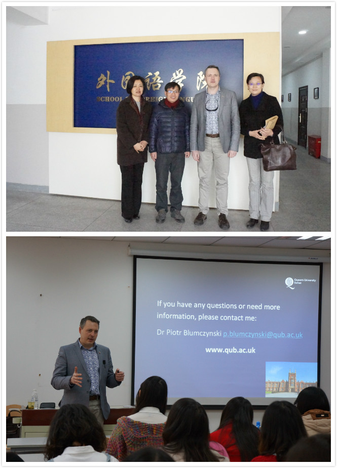 会谈之后,Blumczynski教授在徐汇校区举行了项目宣讲会。他为外国语学院2015级英语专业硕士研究生介绍了交流项目的总体情况、培养目标和培养方式等,并着重介绍了女王大学作为英国罗素大学集团成员之一所具有的教学、师资、研究,以及引导学生未来职业发展方面的突出优势。Blumczynski教授耐心解答了在场学生关于项目的一些疑问,并热枕欢迎大家参与女王大学交流项目。