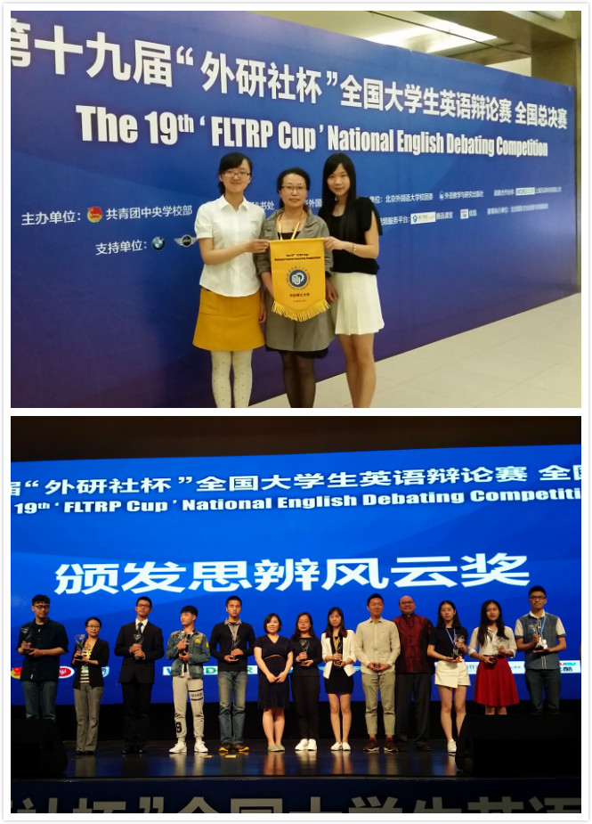 5月18日至24日,第19届“外研社杯”全国大学生英语辩论赛全国总决赛在北京外国语大学举行。经过一轮模拟赛,八轮循环赛,分别与复旦大学、人民大学、香港中文大学等高校辩手同场竞技,我校外国语学院英语系余孙文(英134班)与殷斯琦(英131班)两位选手最终获得全国赛三等奖,参赛队伍荣获“思辨风云”奖。