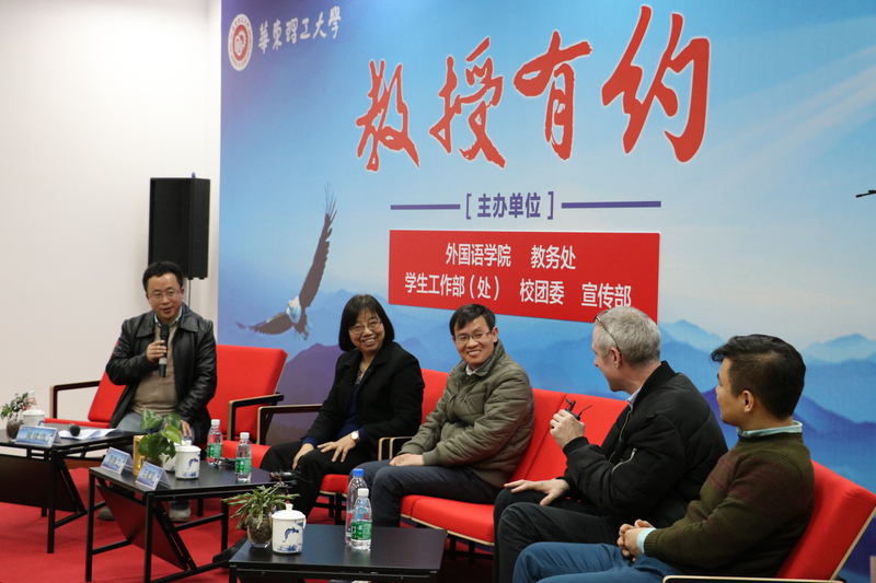 3月29日晚,由教务处、外国语学院等部门联合主办的第5场“教授有约”活动在奉贤校区图文信息中心603室举行。本次活动邀请到外国语学院颜静兰教授、王建国教授和英孚教育集团培训学术经理Ian Oakes出席。外国语学院副院长吴建伟主持,百名学生到场参与。