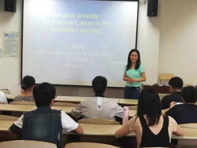 5月11日中午,学院大学英语教学部张艳博士在奉贤校区E教119室为本科生作了一场题为“大学英语词汇学习中的语义韵——你可能忽略的重要细节”的学术讲座。本讲座是人文社会科学处65周年校庆之青年学术论坛(奉贤校区专场)活动之一,外国语学院本学期校庆期间的学术系列讲座活动正式拉开帷幕。