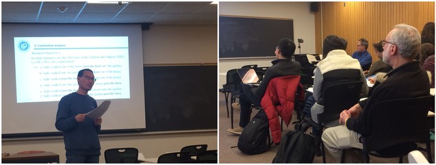 2月8日,外国语学院英语系郑国锋副教授应邀在康奈尔大学语言学系作了题为The Macro-event Property and the Segmentation of English and Chinese Translocative Motion Events的学术讲座。语言学系主任Michael Weiss教授,郑国锋的美方导师、语言学系研究生负责人Molly Deising教授,以及语言学系其他教授和全部博士生参加讲座。