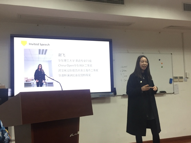 在当晚的“来宾演讲”中,谢飞着重介绍了专业学习方面的所得所获,她以清晰的思路、幽默的语言、厚实的积累和出色的台风向复旦学子展示了华理学子的风采。她的演讲从“内容意识(content awareness)”和“受众意识(audience awareness)”两方面展开,强调演讲内容的核心地位以及受众在公共演讲中的重要作用。