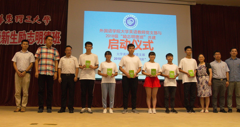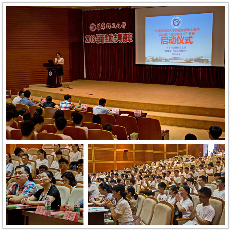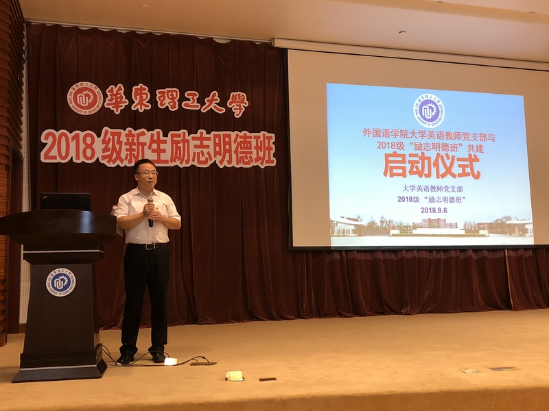 9月6日下午,外国语学院大学英语教师党支部与2018级新生“励志明德班”共建活动启动仪式在奉贤校区敬贤堂举行。学工部部长、校团委书记倪炜,学工部副部长胡兵,外语学院党总支书记王喆、副书记樊俊、副院长吴建伟、大学英语教师党支部16名教师党员、教师志愿者和147名“励志明德班”学生一起参加了启动仪式。活动由大学英语教师党支部组织委员楼燕斐主持。