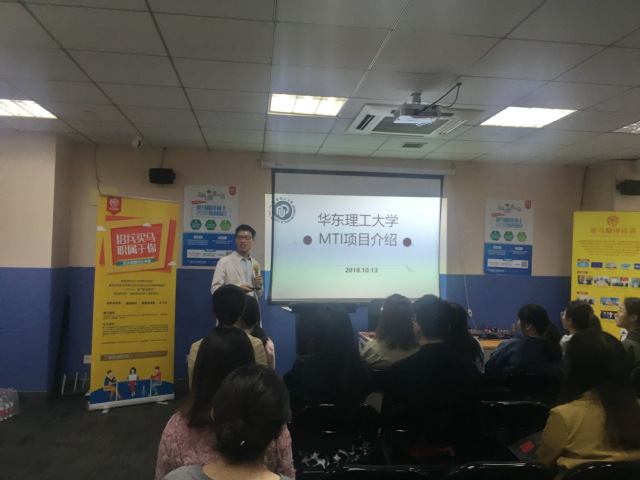 为加强华东理工大学外国语学院翻译硕士(MTI)招生宣传,加强校企合作,吸引更多优质研究生生源。10月13日外国语学院院长助理、MTI中心主任郑国锋副教授与研究生教务员徐颢芳老师应邀参加由上海策马翻译有限公司举办的2018翻译硕士MTI秋季教育展暨填报志愿咨询会(简称:MTI秋季教育展)。