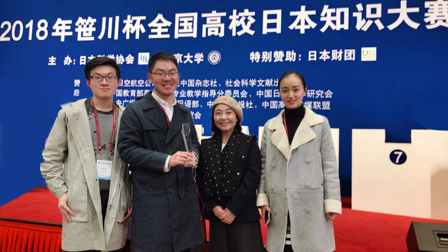11月18日,由“日本科学协会”、北京大学联合主办的为期两天的“2018年笹川杯全国高校日本知识大赛”在北京大学英杰交流中心落下帷幕,来自北京大学、人民大学、上海交通大学等全国109所高校的选手参赛,外国语学院日语系2015级蔡弋鸣同学在激烈的角逐中脱颖而出,以排名第7的优异成绩荣获大赛个人赛三等奖。我校参赛同学的指导教师为外国语学院日语系蒋青。