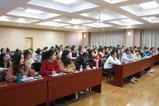 12月9日晚,外国语学院大学英语教师党支部与2019级“励志明德班”学生共建活动系列第二讲在大学生活动中心419教室开讲。大学英语教学部副主任於瑞华副教授应邀为2019级“励志明德班”学生作“大学英语课程学习与学业考试”讲座,现场座无虚席,楼燕斐主持讲座。