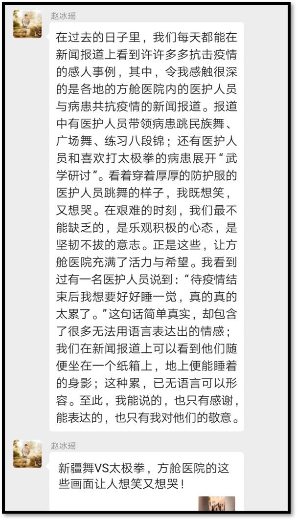 同学们还在“云”团日中主动分享疫情期间令自己感动的人和事。当谈到一名医护人员说“待疫情结束后我想要好好睡一觉,真的真的太累了”时,同学们都表示能够理解他们的辛苦和疲惫,默默地表达着内心的感谢和敬意。
