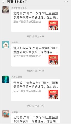 “学习新思想,争做新青年”。外语学院全体本科生在各班团支书的带领下开展了“青年大学习”“云”打卡活动,通过对于习近平总书记关于疫情防控的重要论述和《防控新型冠状病毒肺炎特辑》主题课程的学习,同学们纷纷表示更加理解了“全国一盘棋”的重要性,思想和理论的学习使同学们更加坚定了战胜疫情的信心。