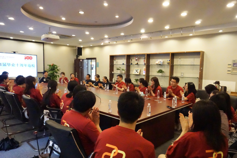 日前,外语学院举行建院20周年系列活动之2011届校友毕业十周年返校活动。外国语学院党委书记王喆、副书记樊俊、副院长吴建伟,英语系、日语系、德语系教师代表,2011届校友以及在校生代表40余人冒雨参加了本次活动。师生见面会由樊俊主持。