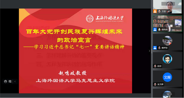 深入学习贯彻习近平总书记“七一”重要讲话精神,推动党史学习教育走深走实,9月17日上午,外国语学院通过线上讲座的形式,组织全体教师、学生党员、入党积极分子开展党史学习教育专题学习。上海外国语大学马克思主义理论学科学术委员会主任、上海市党史学习教育宣讲团成员赵鸣歧教授应邀作了题为“百年大党开创民族复兴辉煌未来的政治宣言——学习习近平总书记‘七一’重要讲话精神”的专题讲座。我校外国语学院党委书记王喆主持讲座。
