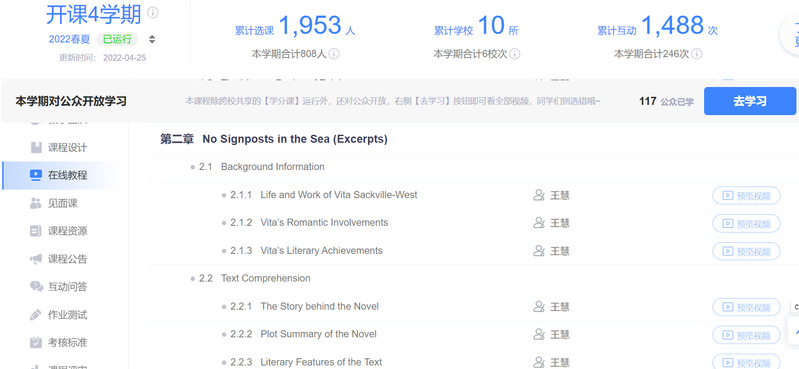 国家级一流课程高级英语教学团队在王慧的带领下,基于疫情当下的学生新需求和网络教学新挑战,优化混合式教学实践,运用新技术、设计新模式,摸索出一条适应新情况的教学路子。疫情期间,团队共组织学生观看自制慕课视频44章节,布置和批改各类型线上训练38余次,设计并实施线上师生、生生互动项目100余次。