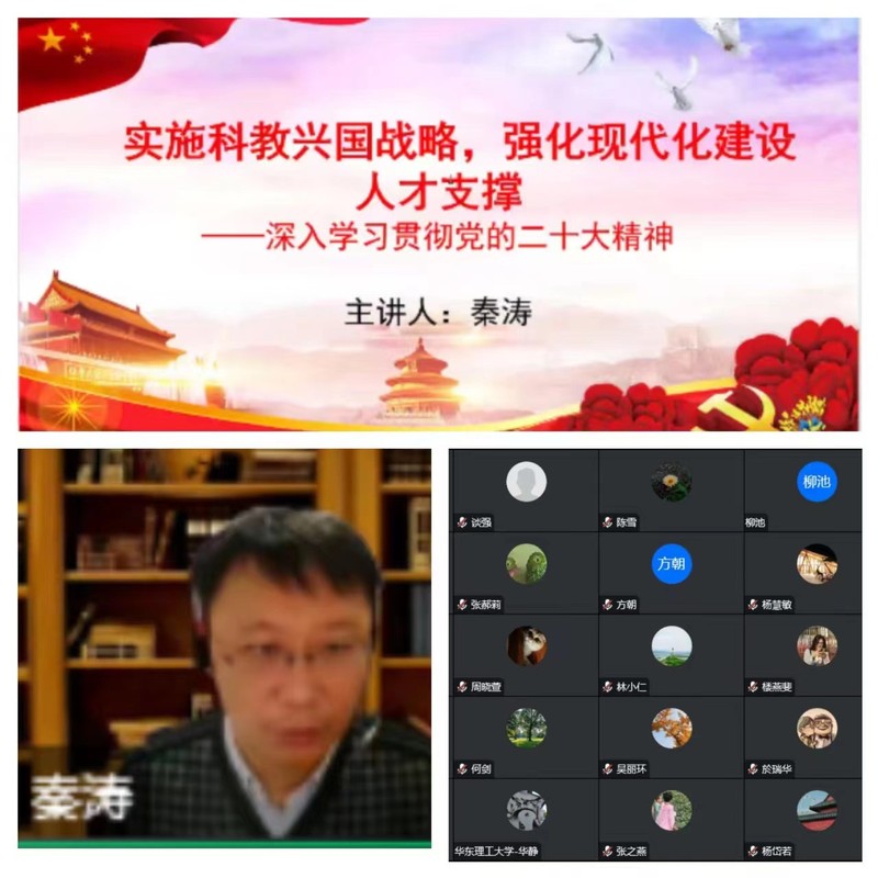 秦涛从我国发展形势面临的问题、应对问题的总方略、完善科技创新体系、加快实施创新驱动发展战略、深入实施人才强国战略、办好人民满意的教育等几个方面对党的二十大报告中的“科教兴国战略”进行了全面系统的阐述。在报告中,秦涛用中国第一支新冠疫苗的研发历程的案例,带领全院教职工深刻领会党的领导对国家科技、教育、人才事业的巨大推动作用。秦涛还详细阐述了习近平总书记关于科技是第一生产力、人才是第一资源、创新是第一动力的重要论述,并从三者之间关系的角度出发,指出“科教兴国战略”对新时代全面实现中华民族伟大复兴的重要意义。