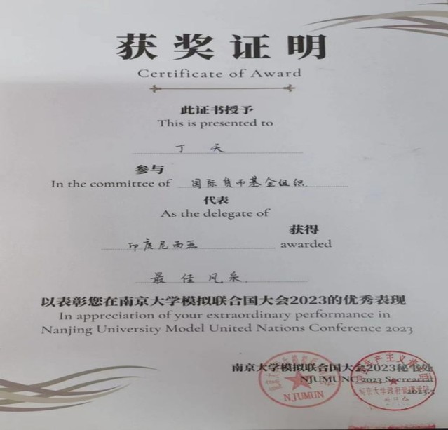 4月30日,丁天同学代表我校应邀参加南京大学模拟联合国大会,与来自南京大学、上海外国语大学、南京外国语学校等四十所高校及高中的近百名主席、代表、观察员共同参与,并通过出色的表现获得“最佳外交风采奖”。