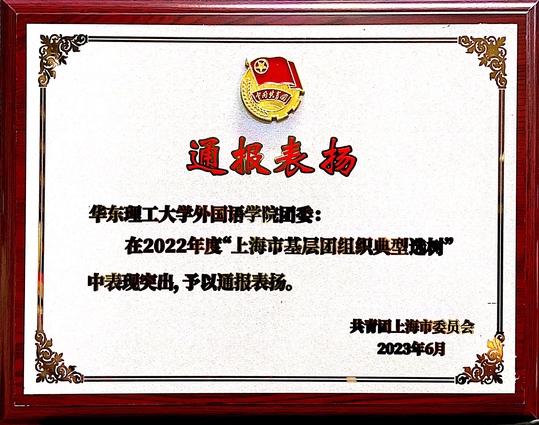 近年来,学院团委坚持全面从严治团,持续激发基层活力,被评为校五四红旗团委标兵;团支部获评上海市高校活力团支部、校十佳团支部、校十佳团日活动等;团干部获上海市高校团干部示范典型、校青年五四奖章提名奖等荣誉称号。