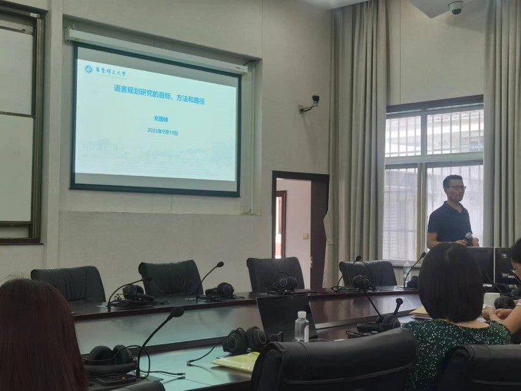 9月19日下午,郑国锋教授在徐汇校区三教三阶上作题目为“语言规划研究的目标、方法和路径”的学术讲座。本次讲座由副院长张正军教授主持,共60多名师生参与。