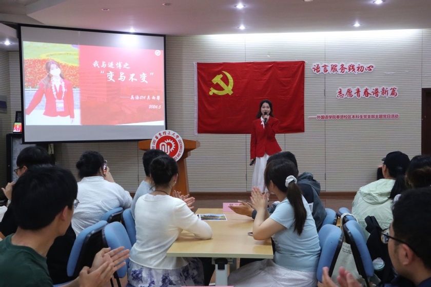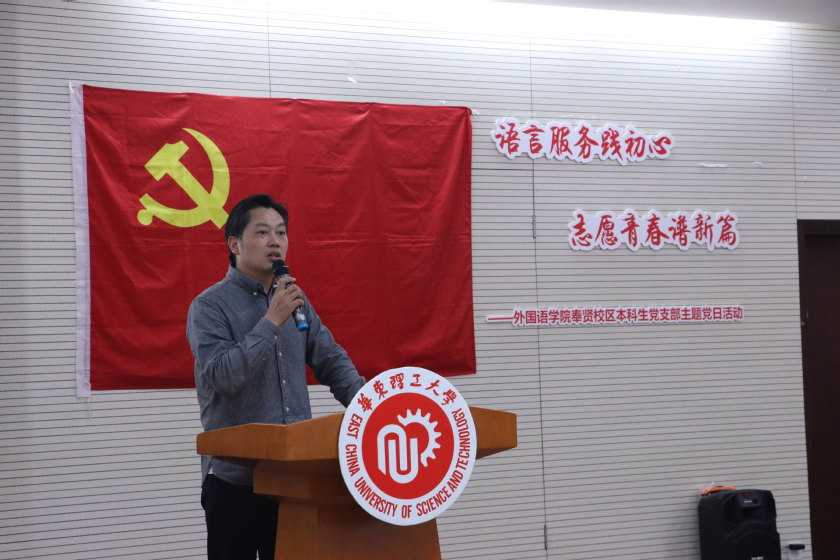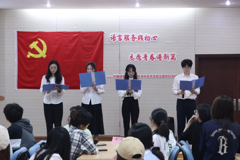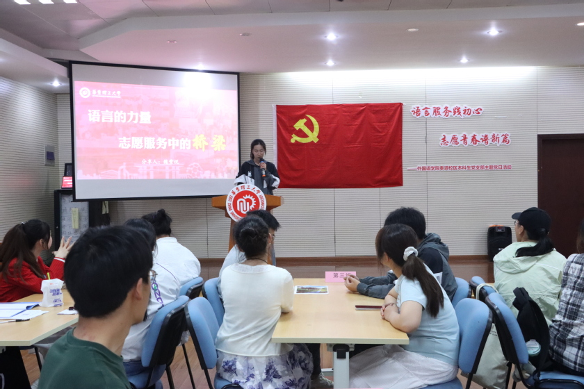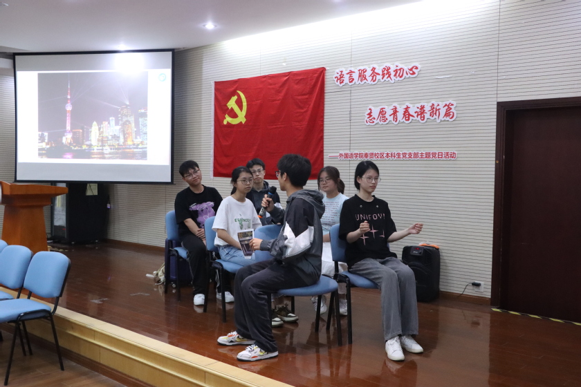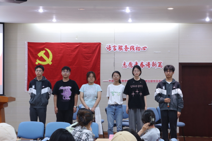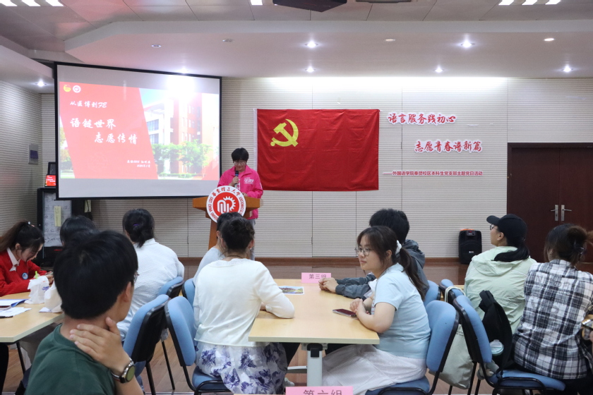 为学习贯彻习近平新时代中国特色社会主义思想和党的二十大精神,深入实施时代新人铸魂工程,落实立德树人根本任务,以高质量党建推动“一站式”学生社区综合管理模式改革创新发展,5月28日下午,外国语学院奉贤校区本科生党支部在E231开展“语言服务践初心,志愿青春谱新篇”主题党日观摩活动,院党委副书记樊俊、辅导员侯月、林小仁以及来自校其他兄弟院系的党务工作者参加活动。活动由外国语学院学生党员张静主持。