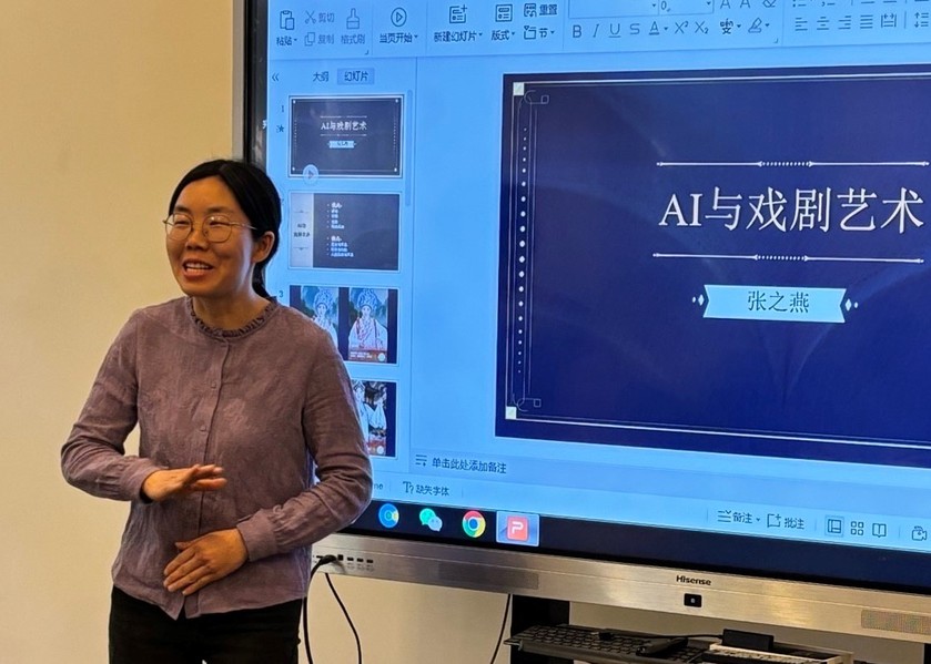 张之燕副教授在“AI与戏剧艺术”汇报中,通过AI换脸戏曲表演、戏服设计等案例展现技术赋能的艺术创新与科技灵韵,但指出戏剧的“在场性”与“不完美性”无法被AI替代。她结合小班互动教学实践,呼吁增强文学课堂互动性,重视戏剧中真人演绎的情感真实与即兴魅力。