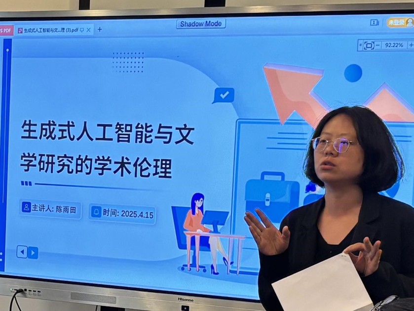 陈雨田博士聚焦“生成式人工智能与文学研究的学术伦理”,以毕业论文写作课教学和高校学生AI使用率直观展示人工智能应用文学研究现状。她提出在这一背景下存在的内容剽窃认定模糊、隐蔽性数据泄露风险、自增强的虚假信息及算法偏见四大学术伦理问题,并总结为“不排斥,需警惕”的辩证态度,强调学术规范与透明声明的必要性。
