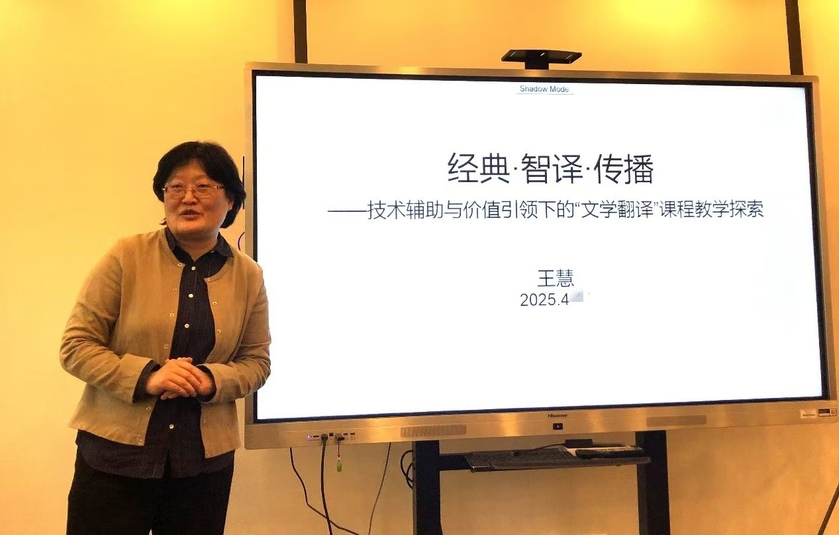 王慧教授在“经典·智译·传播:技术辅助与价值引领下的文学翻译教学探索”汇报中,详细阐述了“知、能、用、明、思、辩”六维培养目标。她结合具体案例,提出通过校内学习平台整合技术资源、建设思政与名译案例库、开展翻译竞赛等第二课堂活动,以及改革考核方式,激发学生翻译创造力。王慧教授特别指出,AI翻译工具虽能提升效率,但无法替代学生的文化敏感度与批判性思维,教师需在教学中强化学术诚信教育,引导学生平衡技术依赖与人文价值。